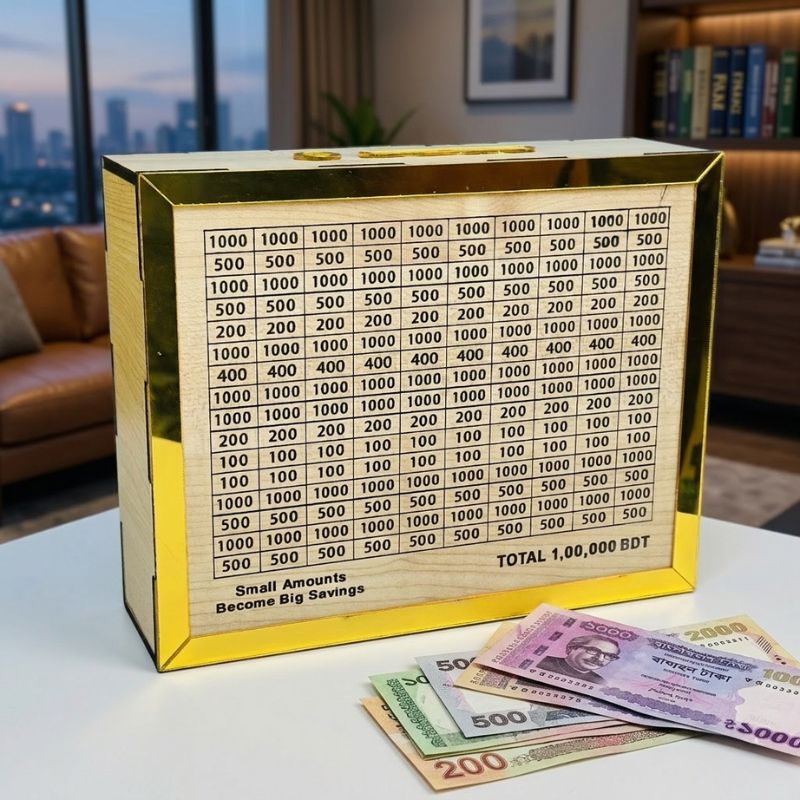 Wooden Swiss Bank Savings Box – 1 Lakh BDT Savings Challenge Tracker for Kids & Adults